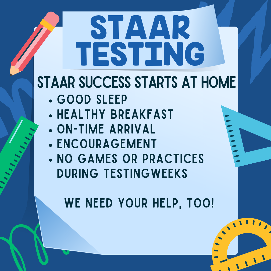 STAAR testing kicks off Tuesday, April 14, and we are excited for our students to show what they know! As we head into the weekend, please help your child take it easy, get plenty of rest, and stay on a good routine—Tuesday is go time!